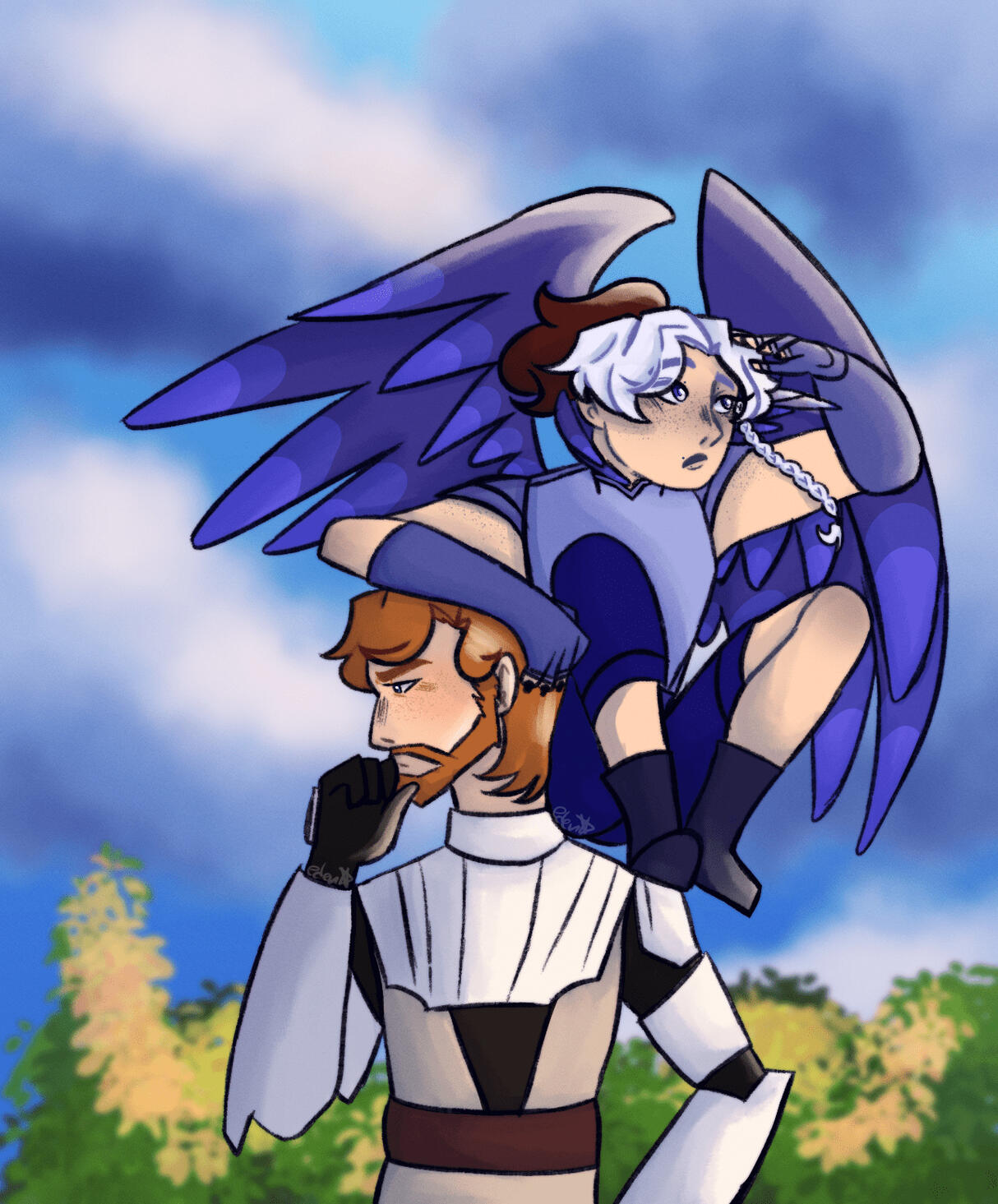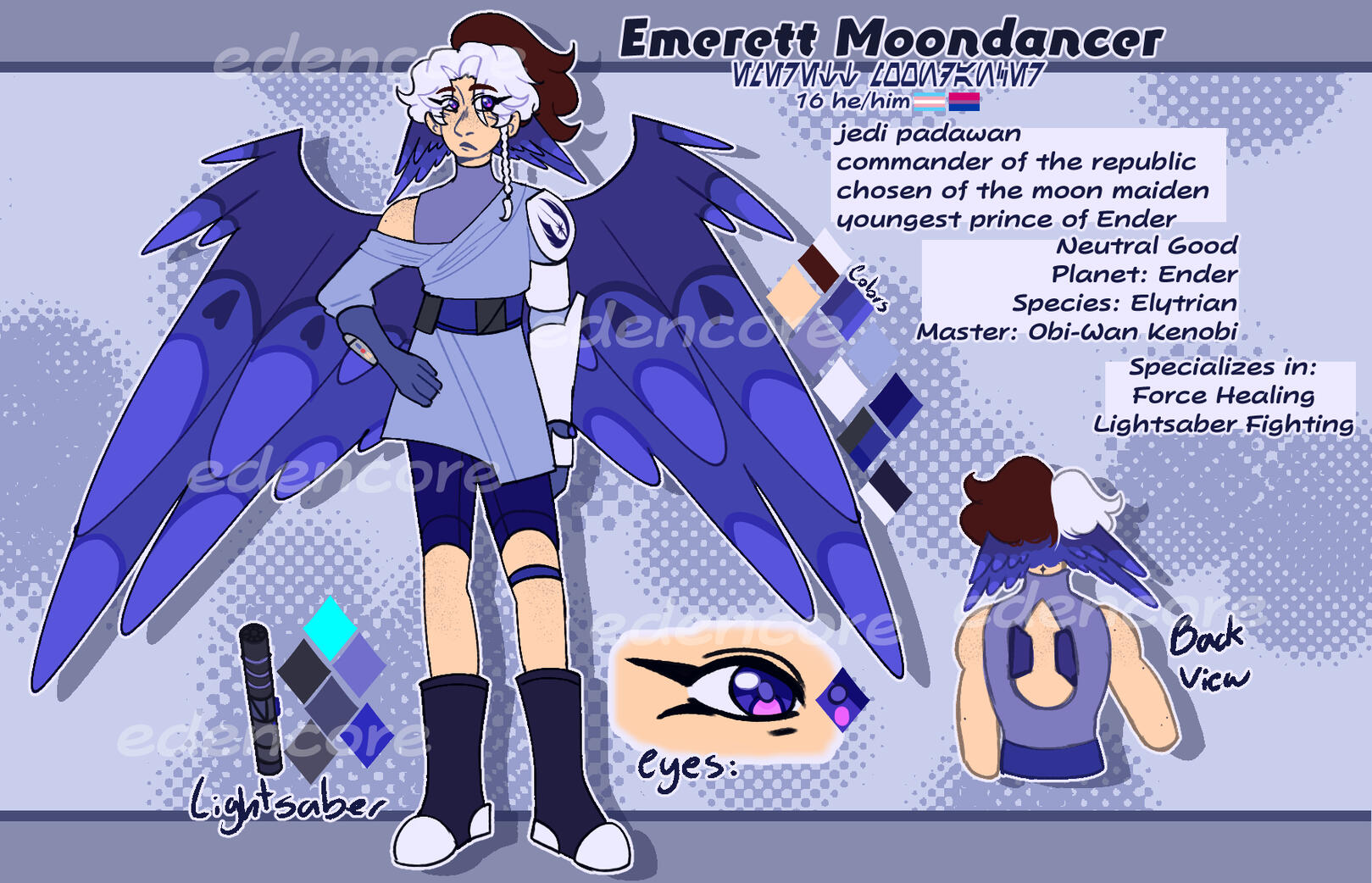 Emerett is the youngest son of the Moondancer Family, also being the only force sensitive one. He was taken by the Jedi at age four after his mother allowed them to take him without his father permission, basically forcing him to accept the deal with the Jedi. At the temple, Emerett learned how to use the force as well as other jedi training such as lightsaber practice. At the beginning of the Clone Wars, he was assigned to be Obi-Wan Kenobi's padawan.Being a padawan during the Clone Wars was hard, facing many hardships... Emerett did not have a normal training, none of his peers did as they had to survive endless battles against droids and unpleasant villains such as Asajj Ventress and Count Dooku, one of the silent leaders of the Separatists. Emerett also had to face his own personal hardships, as he had an internal battle between his jedi teachings and what he was seeing from the Senate, growing dissatisfied of the system he grew up in.As of currently, he is not the same bright eyed child he was before, getting closer to his jedi trials, Emerett is tired of the war, the bones in his wings ache from endless days of flying, he is more unsettled as the force grows darker, everyone seem to think the end of the war is close, but he feels it's not like everyone thinks it's going to be...